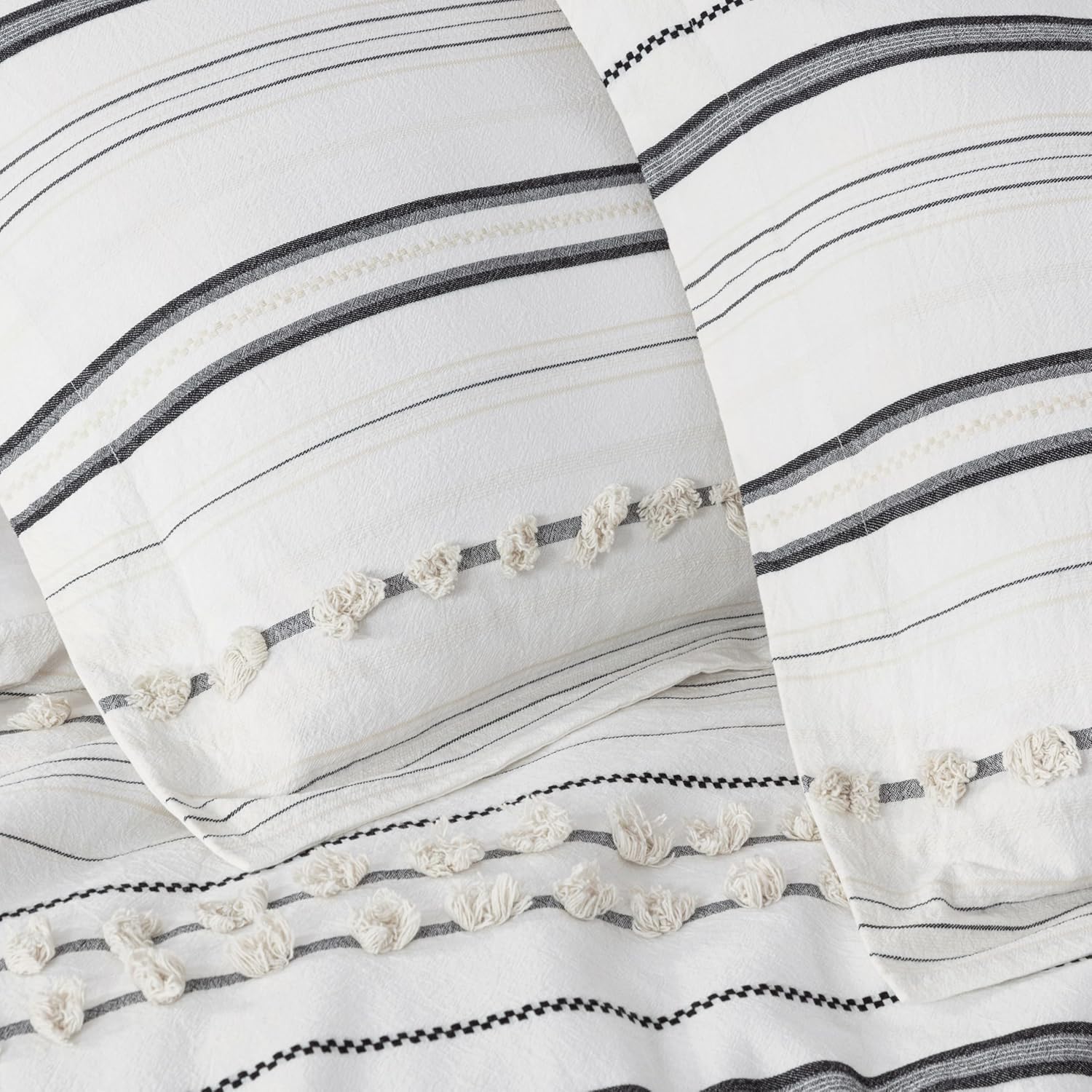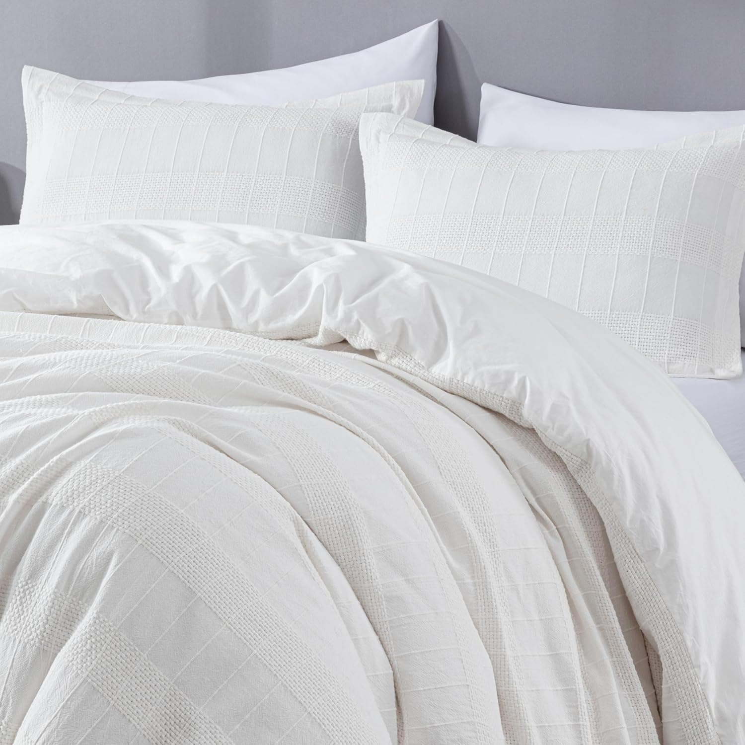 Transform your bedroom into a cozy retreat with our 3-Piece Cotton Clip Jacquard Duvet Cover Set. This set includes a beautifully designed duvet cover and two matching pillow shams, all crafted from premium cotton to ensure a soft and breathable sleeping experience. The elegant woven striped pattern with clip jacquard detailing adds a touch of chic farmhouse charm to any modern bedroom decor. A soft linen-like textured feel which adds a personal touch to bring an eye-catching update to your decor. Made from high-quality materials, this duvet cover set is both durable and comfortable, making it perfect for year-round use. The cotton fabric provide excellent breathability, ensuring a cool and comfortable night's sleep. The duvet cover features a hidden button closure and 8 corner ties to keep your duvet insert securely in place, while the pillow shams have envelope closures for a neat and tidy finish. Upgrade your bedroom decor and enjoy the perfect blend of style and comfort with this elegant duvet cover set.