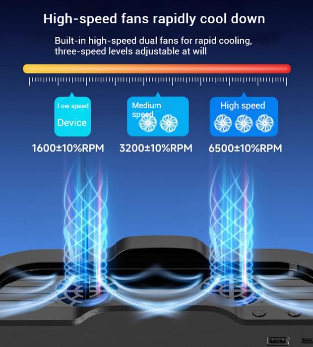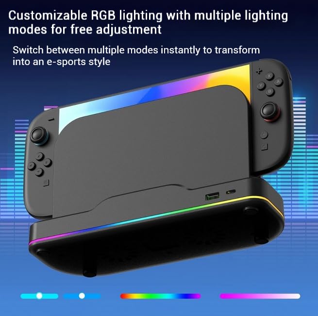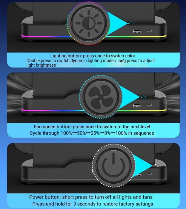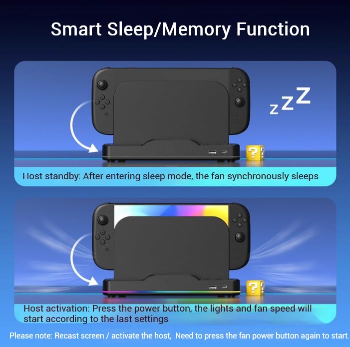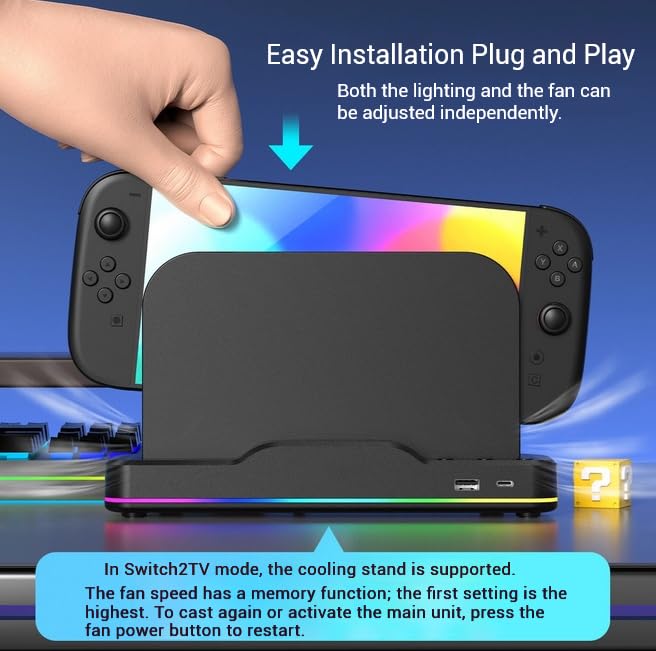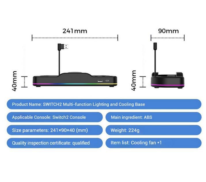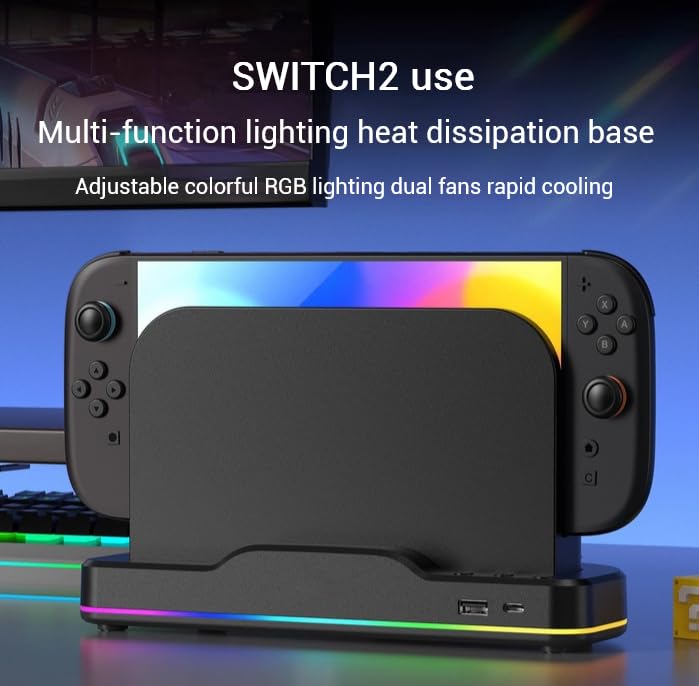 1. Applicable models: Dual-fan cooling stand designed for Switch 2 original base, a multi-functional all-in-one accessory. 2. Built-in high speed dual fans, fast cooling, support strong / medium / weak three wind speed adjustable, low speed 1600 ± 10% RPM, medium speed 3200 ± 10% RPM, high speed 6500 ± 10% RPM. 3. Equipped with RGB lighting effects, a variety of lights freely adjustable, a variety of modes of one-key switch. Lighting buttons: single press to switch the color, double press to switch the lighting mode, long press to adjust the brightness of the light. 4. Provide one USB-A 2.0 and one Type-C 2.0 expansion port, convenient to connect to different devices for charging or data transmission. 5. Package content: cooling base *1