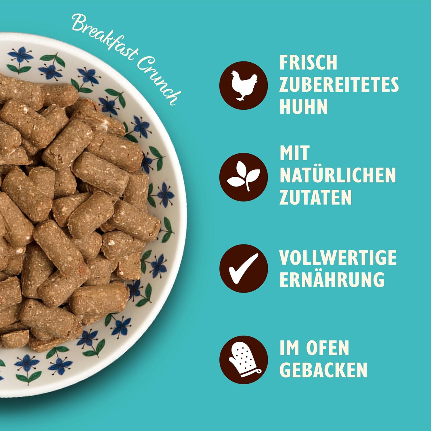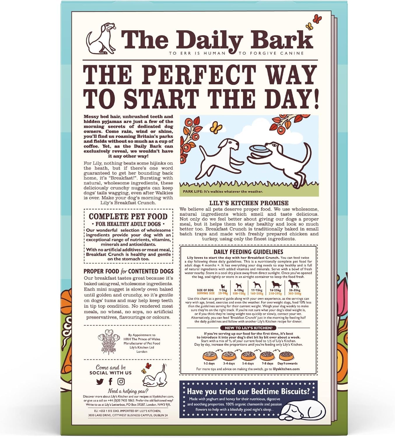 This baked Breakfast Crunch is the perfect way to start your dogs day! These toasted nuggets of deliciousness are made with lots of freshly prepared turkey meat and chicken livers, as well as yoghurt, berries, bananas, sunflower seeds, honey and oats. Lily's Kitchen adds botanical herbs like rosehips and marigold petals for your dogs holistic health and a splash of clear pressed salmon oil to put an extra spring in their step and sparkle in their coat. Each mini nugget is slowly baked until golden and crunchy, so this recipe is gentle on dogs tums and good for their teeth. No rendered meats, carcass or derivatives, nothing genetically modified, no artificial preservatives, colours, taste enhancers or sweeteners. No wheat, corn or soya. Lily's Kitchen uses only whole meats, grains, fruit and vegetables - to produce a delicious, nutritious, digestible food for your dog.