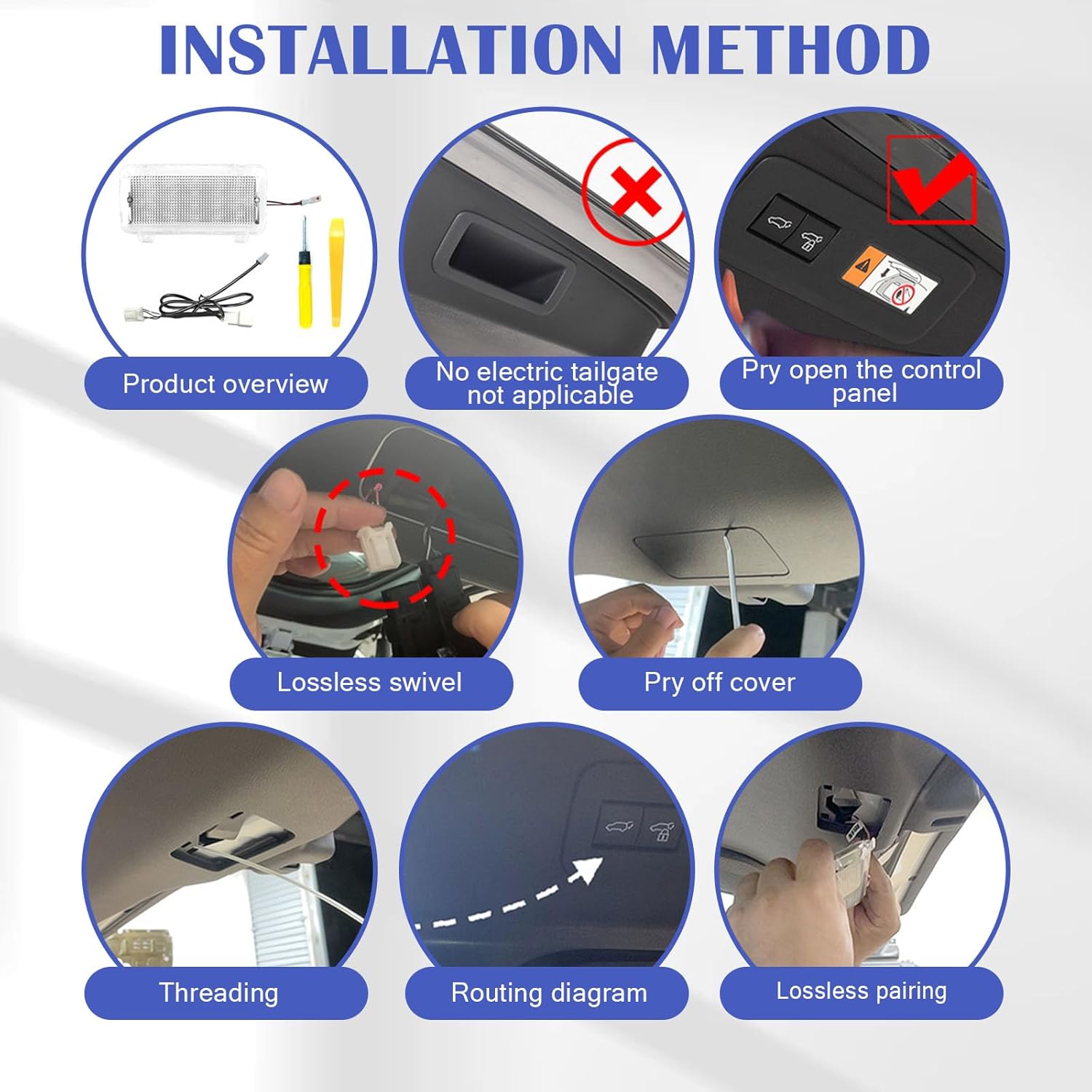 | Included Components | 1x LED Trunk Ceiling Hatch Light, 1x Pry Tool, 1x Wiring Harness |