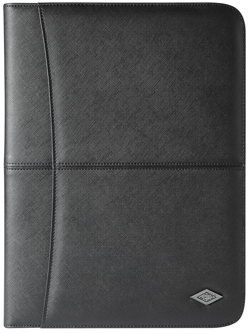 Wedo 58 64301 Accento Conference Folder for A4 Documents. Zip fastened High-quality conference folder in a modern design made of hard-wearing artificial leather. Fitted with an A4 outer pocket and practical interior partition. Supplied with A4 writing pad. The interior fittings feature A4/A5 fold-out compartments, one zipper compartment, one transparent window for business cards, four card compartments, two additional pockets and one rubber loop for a writing instrument. Colour: black. Size: approx. 25.5 x 4.5 x 33.5 cm. Read more